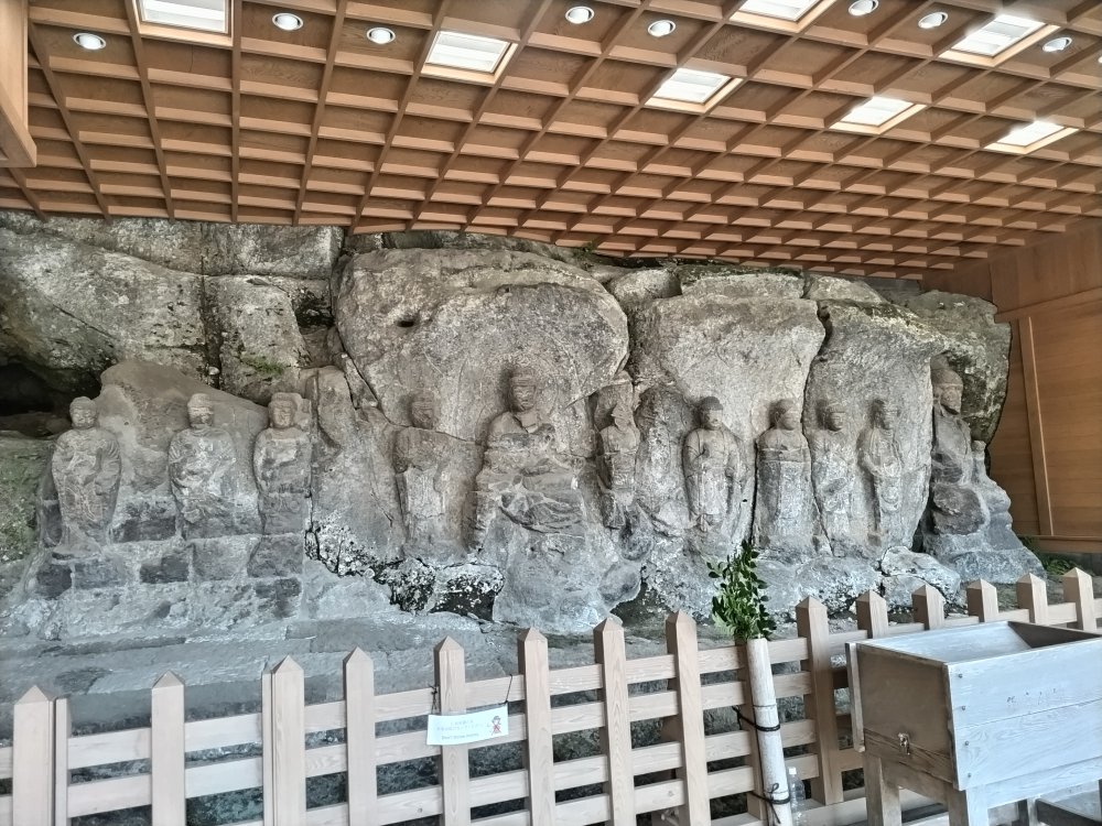 臼杵石仏では、この間ぜひ注目してほしい場所があります。ホキ石仏第2群第2龕です。(入口から一番近い場所で「九品弥陀」と呼ばれる9躯の阿弥陀如来さまが並んでいます。)